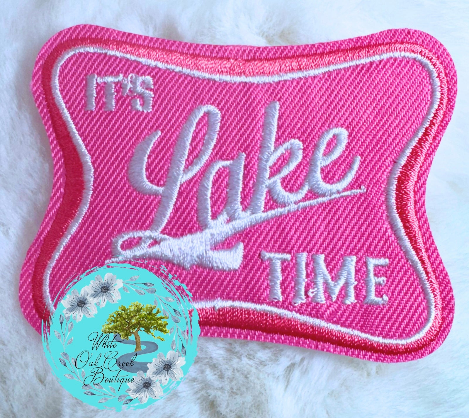 Lake Time Pink Embroidered Iron on Trucker Hat Patch 3.15” wide x 2.44” tall with adhesive backing
